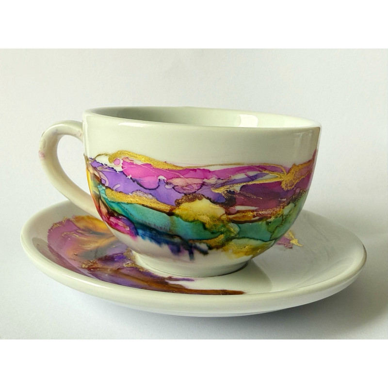 Unikalna filiżanka porcelanowa ze spodkiem  zdobiona  tuszami alkoholowymi przez podopiecznych Fundacji Dorotkowo podczas zajęć arteterapii. Każdy egzemplarz to efekt twórczej pracy i zaangażowania, który czyni go wyjątkowym.