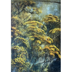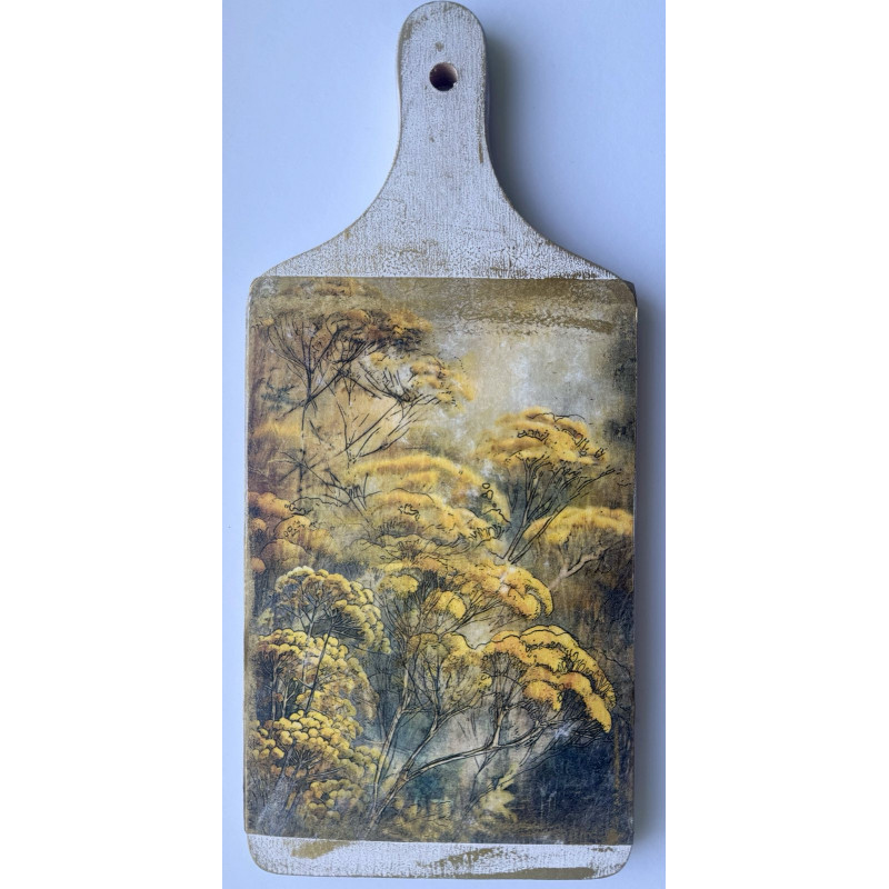 Drewniana deska zdobiona metodą decoupage przez podopiecznych fundacji Dorotkowo na zajęciach arteterapii.